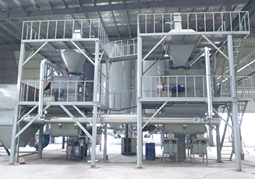 砂漿生產線主要由原料儲存系統、配料稱重系統、輸送系統、混合系統、氣相平衡系統、包裝系統及除塵系統構成。主控制系統依據選定工藝配方下達生產指令,系統自動從儲料倉中按配比提取原料,原料經配重后依次進入待混倉及無重力高效混合機,實現快速混合作業。