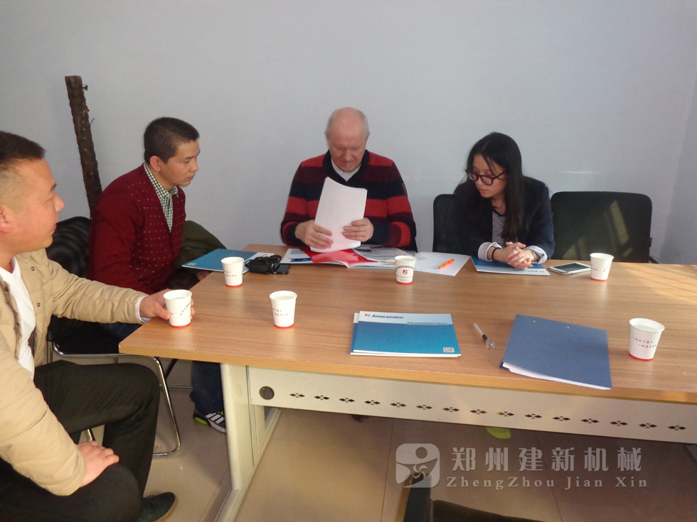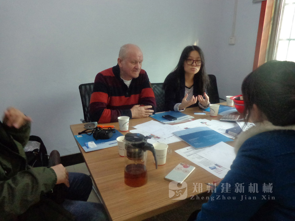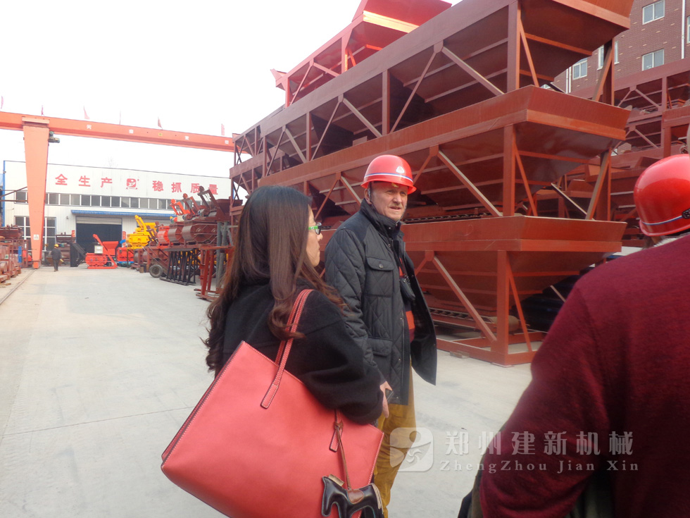 2014年11月,來自俄羅斯的客戶來到鄭州建新公司簽訂了兩套時產120方混凝土攪拌站設備的大訂單,下圖為建新公司銷售部劉經理、經理帶客戶參觀建新公司的生產車間及成品貨場。