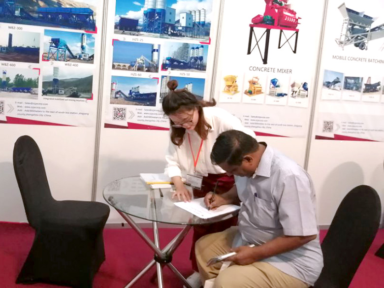 混凝土攪拌站、WBC系列穩定土拌合站等產品吸引了絡繹不絕的觀展者駐足洽談。接待人員不失時機地向來觀展的客戶介紹建新機械的技術優勢、產品特點、售后服務及銷售代理政策,其熱情的講解受到了廣大斯里蘭卡客戶和當地工程機械人士的關注,部分客戶當場展開了詳細的商談。