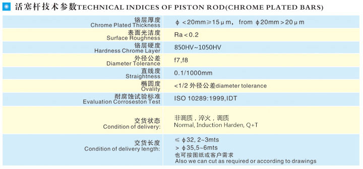 本產品表面經特殊研磨及硬鉻電鍍技術外理,再經鏡面拋光而成,具有耐磨擦、抗腐蝕性特性,可用作各種氣缸、油缸、包裝機械、木工機械、紡織機械、印染機械、壓鑄機、注塑機及其它機械的導桿、頂桿。